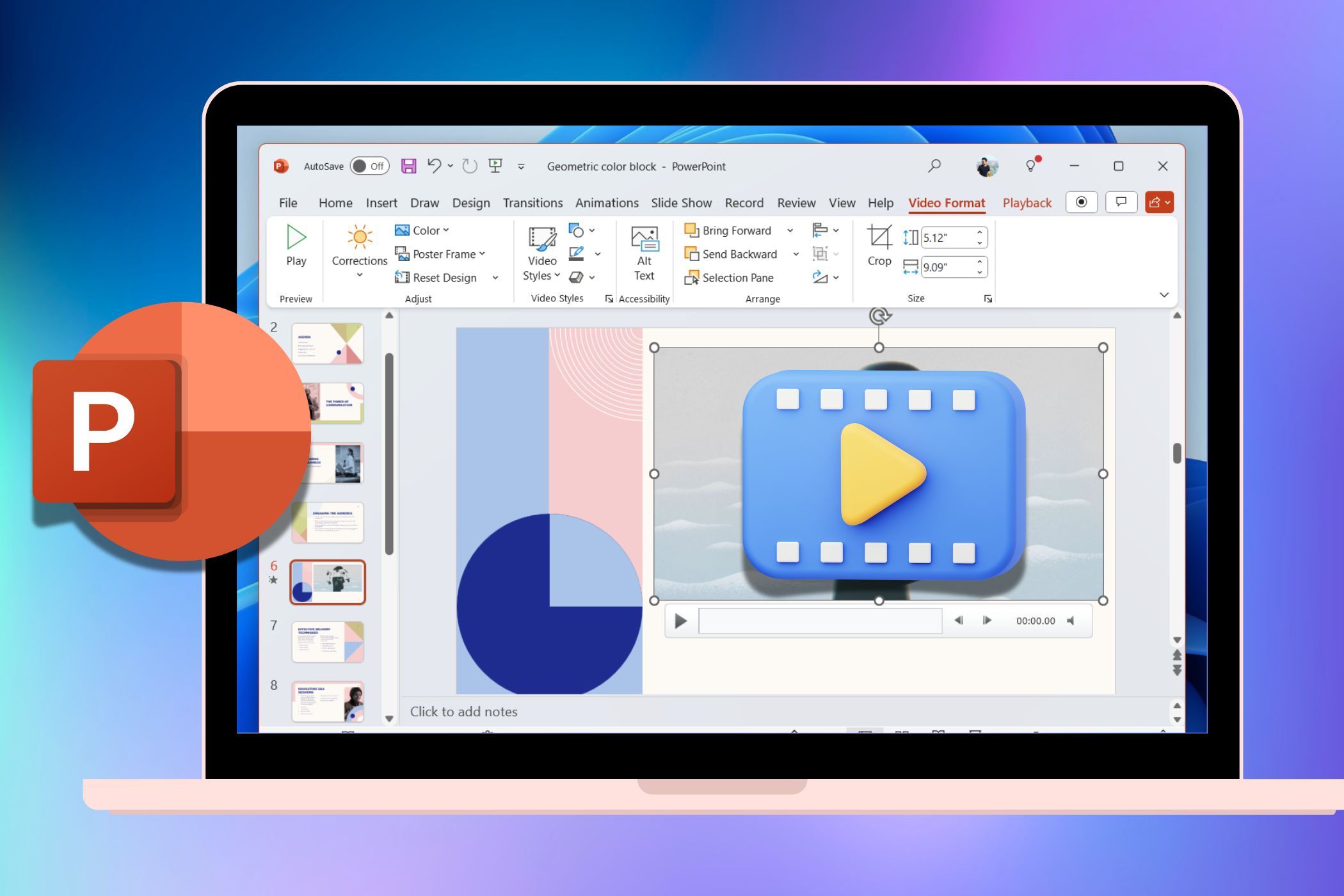 پاورپوینت انواع افکتهایی را ارائه میدهد که میتوانید با آنها ویدیوهای خود را یا بهصورت یکپارچه در طرح ادغام کنید یا بهعنوان نقطهٔ کانونی برجسته کنید.